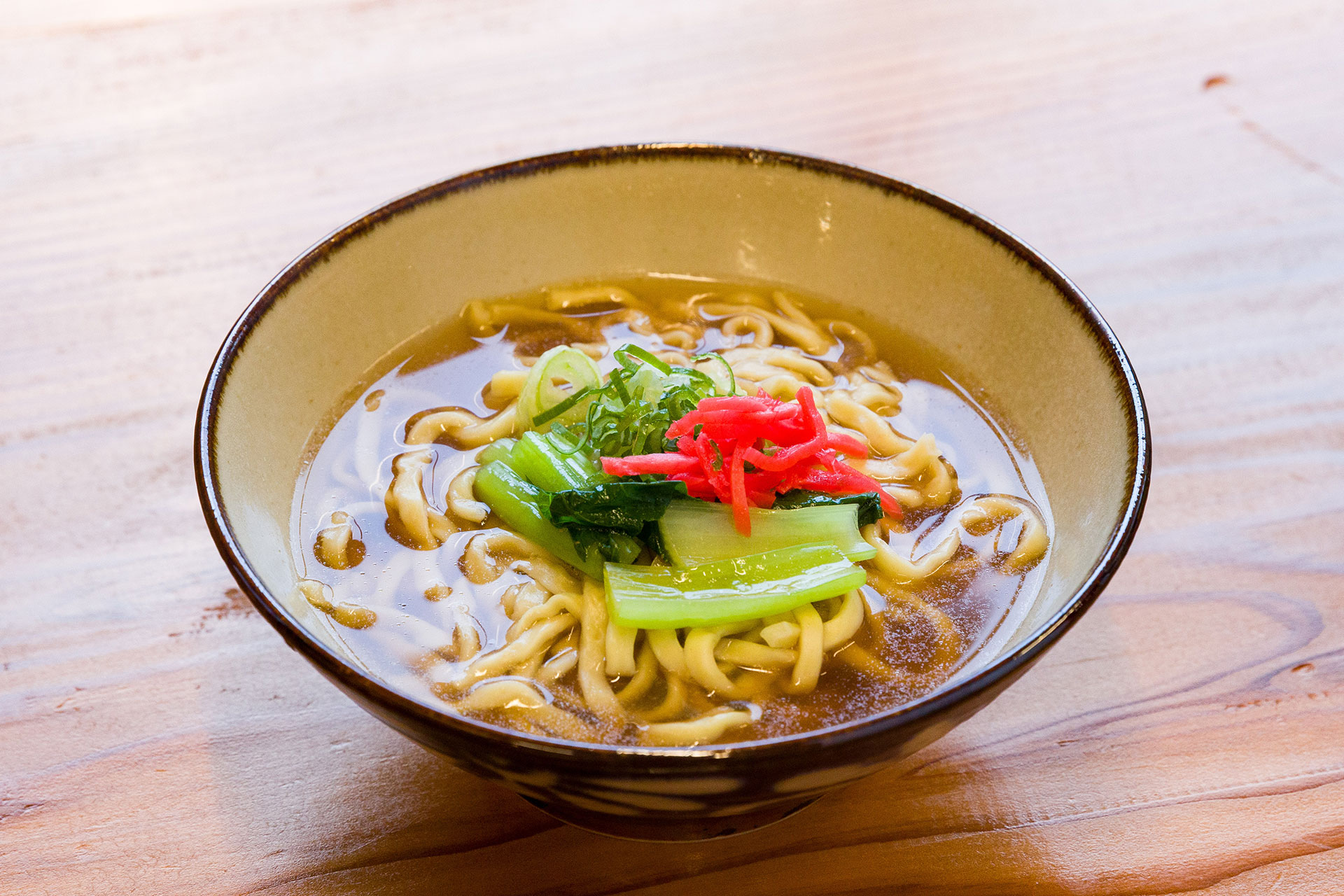 沖縄そばの命でもある麺は、沖縄の製麺所へ直接交渉し、特別に空輸してもらい、仕入れております。スープはあぐー豚の骨をじっくり煮込んだ清湯スープに椎茸やかつお節などを入れ、熟考を重ねたオリジナルスープです。とろとろのやわらかお肉は豚の軟骨を5時間煮込み、1日寝かせた手間暇かけた逸品です。どこか懐かしいような沖縄の情景を想う自慢の沖縄そばを皆様に召し上がっていただきたく、1品だけのお品で提供させていただきます。ぜひ店主の思いの込めた逸品をご賞味ください。
